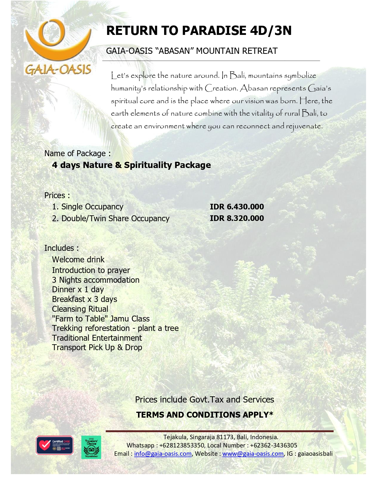 In Bali, mountains symbolize humanity’s relationship with Creation. Abasan represents Gaia’s spiritual core and is the place where our vision was born. Here, the earth elements of nature combine with the vitality of rural Bali, to create an environment where you can reconnect and rejuvenate. Let’s spend 4 days or even 5 days with our packages that we offer to really enjoy Abasan ambience.